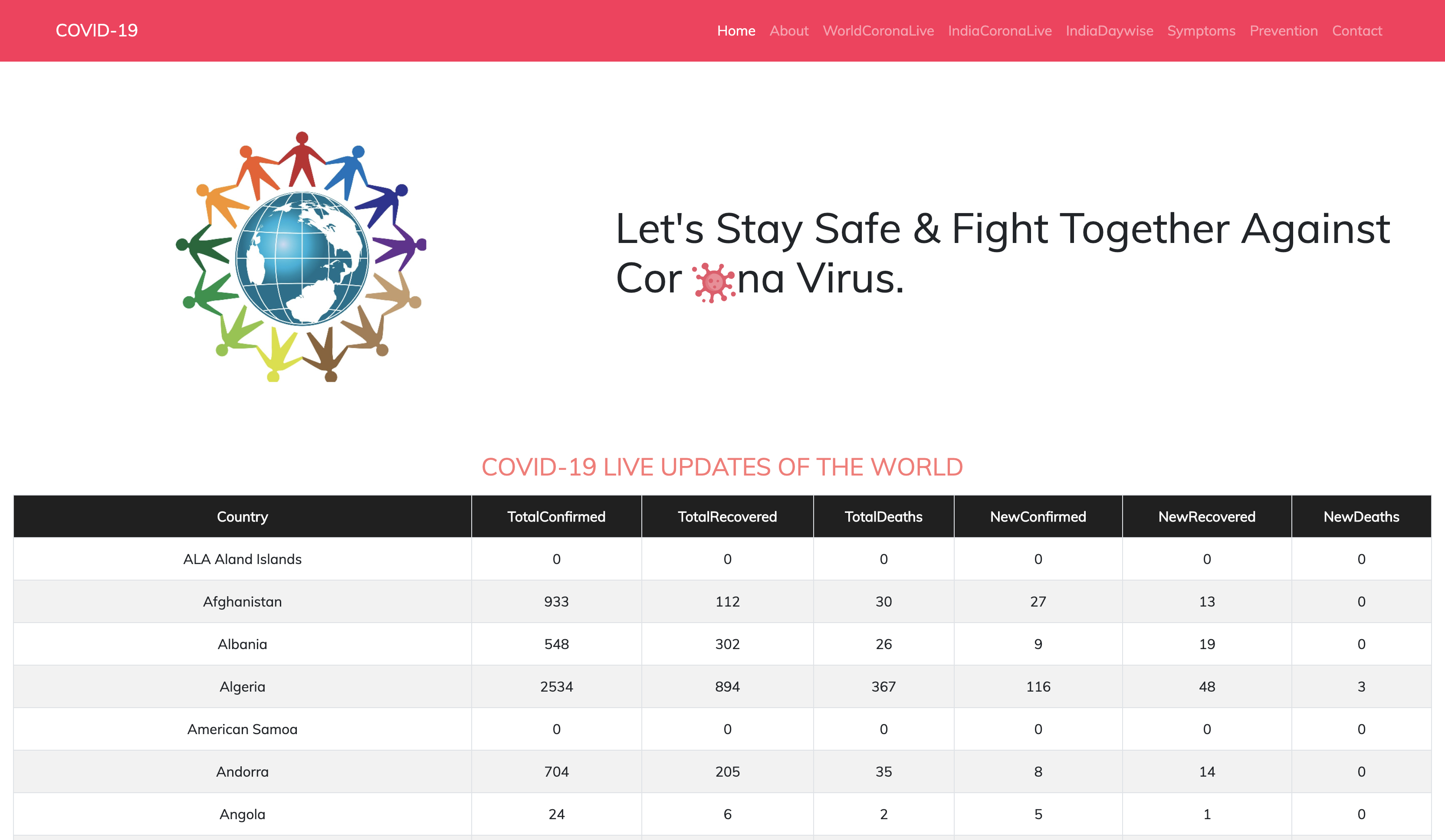 A live covid-19 website that gives you info about corona-virus, symptoms, preventive measure and all the live cases around the globe and specially INDIA (State-wise & Day-wise)